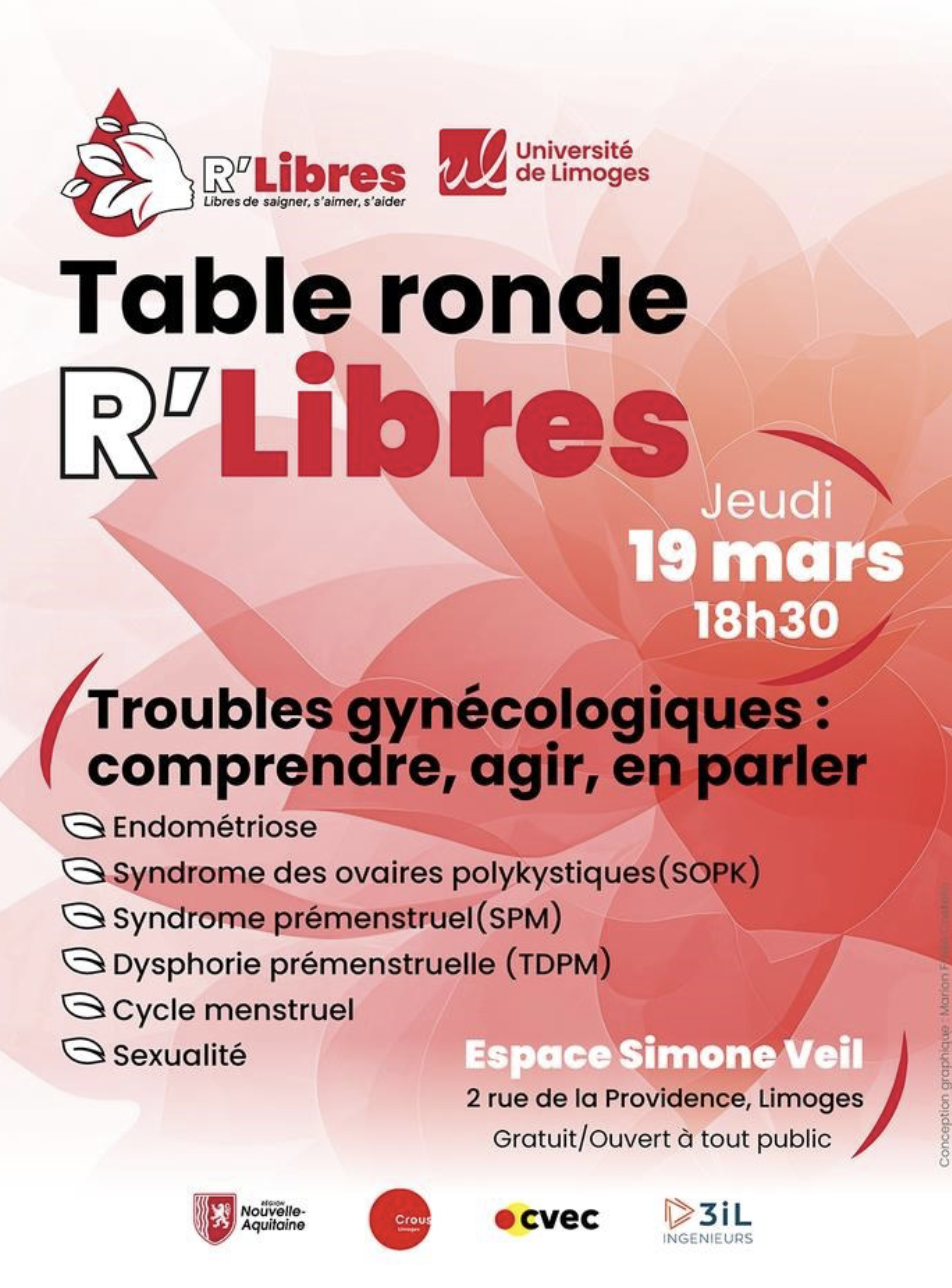 <p><!-- wp:paragraph --></p> <p>Notre bénévole Elise sera présente à la table ronde R’Libre à l’Université de Limoges pour mieux comprendre et échanger autour de plusieurs troubles gynécologiques et sujets essentiels comme :</p> <p><!-- /wp:paragraph --></p> <p><!-- wp:paragraph --></p> <p><strong>La sexualité :</strong> comprendre, déconstruire les tabous et mieux s’informer.</p> <p><!-- /wp:paragraph --></p> <p><!-- wp:paragraph --></p> <p><strong>L’endométriose :</strong> maladie inflammatoire chronique dans laquelle un tissu semblable à la muqueuse utérine se développe en dehors de l’utérus, provoquant des douleurs et des complications.</p> <p><!-- /wp:paragraph --></p> <p><!-- wp:paragraph --></p> <p><strong>Le SOPK (Syndrome des Ovaires Polykystiques) :</strong> trouble hormonal fréquent pouvant entraîner des cycles irréguliers, des douleurs, une prise de poids ou des difficultés de fertilité.</p> <p><!-- /wp:paragraph --></p> <p><!-- wp:paragraph --></p> <p><strong>Le SPM (Syndrome Prémenstruel) :</strong> ensemble de symptômes physiques et psychologiques survenant avant les règles.</p> <p><!-- /wp:paragraph --></p> <p><!-- wp:paragraph --></p> <p><strong>Le TDPM (Trouble Dysphorique Prémenstruel) :</strong> forme sévère du syndrome prémenstruel avec des symptômes émotionnels et physiques intenses.</p> <p><!-- /wp:paragraph --></p> <p><!-- wp:paragraph --></p> <p><strong>Le cycle menstruel :</strong> son fonctionnement, ses variations et son impact sur la santé</p> <p><!-- /wp:paragraph --></p>